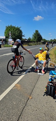 Kaum zu glauben, aber die Wetterbedingungen waren traumhaft: Sonne und fast 30°. Den ersten Lauf über sehr anspruchsvolle 10 km (Berg-)Lauf ging ich sehr kontrolliert an (Der Tag war ja noch lang) und wechselte als 8. auf’s Rad. Insgesamt 150 km, also 3 Runden (mit je 3 Bergen und teils sehr steilen Anstiegen) von je 50 km waren zu absolvieren. Auf dem Rad fühlte ich mich wie immer super und ich konnte mich teilweise in den Bergaufpassagen sogar bis auf Platz 4 vorarbeiten. Schließlich ging ich als 6. auf den abschließenden 30 km-Lauf (3km bergauf, dann wellig, davon 1 extrem steiler Anstieg, dann wieder 3 km bergab und das gleiche nochmal). Bergauf ging’s super, bergab wurde ich dafür wieder durchgereicht (vielleicht sollte ich das Bergablaufen auch mal trainieren…), und oben wurde es richtig heiß und zu wenig Wasser an den Verpflegungsstellen ergattert. Glücklicherweise dann eine rettende Wasserflasche von Tom. Und Cornelia war extra auf den Berg gegangen, um mich weiter anzufeuern und zu motivieren. Danke!