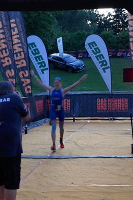 Dieses Jahr spielte das Wetter besser mit als im Vorjahr, als Regen und kühle Temperaturen den Wörthsee-Triathlon erschwerten. Bei trockenem und sonnigen Wetter ging es aufgrund der hohen Wassertemperatur ohne Neoprenanzug zur ersten Disziplin - dem Schwimmen. Katrin verließ das Wasser als 16. Frau, hatte aber die beste Wechselzeit und startete trotz stark besetztem Teilnehmerfeld eine fulminante Aufholjagd. Mit der zweitbesten Radzeit fuhr sie auf den 3. Platz vor, mit Tuchfühlung zu den beiden führenden Damen. Bereits nach den ersten Kilometern übernahm sie die Führung und gab diese bis ins Ziel nicht mehr ab.