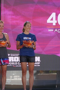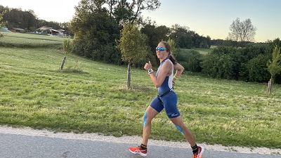 Vierte der Altersklasse W 40 auf die Radstrecke. Dort konnte sie weiter Zeit und Plätze gutmachen und kam mit geringem Rückstand auf die vor ihr liegenden Athletinnen als Dritte zum Wechsel. Nach 3 km Lauf übernahm sie die Spitze in ihrer Altersklasse,