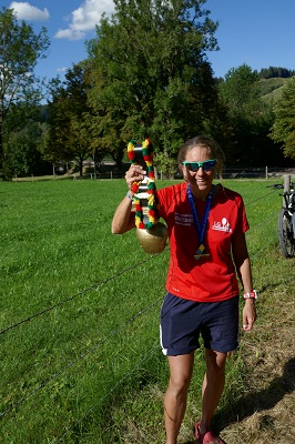 über ca. 30 km Berglauf konnte Katrin ihre Verfolgerin auf Distanz halten und kam mit 8,5 min.