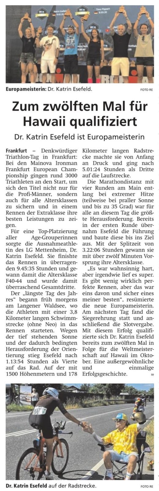 "Powerman Zofingen: Gold für Katrin Esefeld, Bronze für Konrad Puk und Michael Schmidkonz" auf der Webseite Bayerischer Triathlon Verband (BTV) vom 11.9.2025 Autorin: Christine Waitz